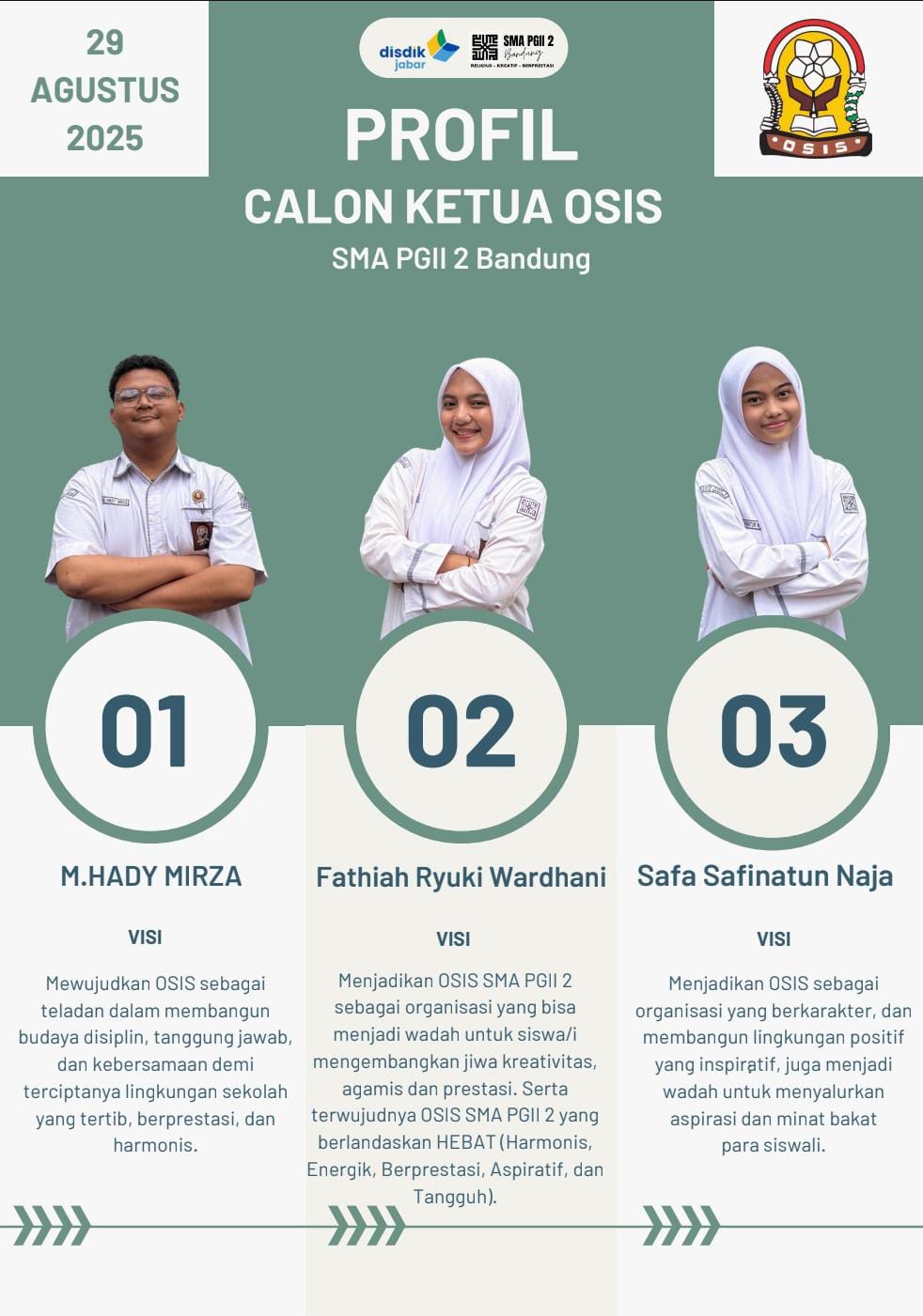 Bandung, 28 Agustus 2025 – SMA PGII 2 Bandung menggelar debat terbuka calon Ketua OSIS periode 2025/2026 di aula sekolah. Acara ini diikuti oleh seluruh siswa, dewan guru, serta pembina OSIS dengan penuh antusias dan menjadi momen penting dalam proses regenerasi kepemimpinan di lingkungan sekolah.Tiga kandidat calon Ketua OSIS tampil dalam debat tersebut, yaitu M. Hady Mirza (01), Fathiah Ryuki Wardhani (02), dan Safa Safinatun Naja (03). Ketiganya menyampaikan visi dan gagasan yang berbeda namun sama-sama bertujuan untuk memajukan OSIS SMA PGII 2 Bandung.Hady Mirza menekankan pentingnya disiplin, tanggung jawab, dan kebersamaan untuk menciptakan lingkungan sekolah yang harmonis.Fathiah Ryuki Wardhani membawa konsep OSIS HEBAT (Harmonis, Energik, Berprestasi, Aspiratif, Tangguh) dengan menekankan kreativitas, prestasi, dan nilai keagamaan.Safa Safinatun Naja menyoroti peran OSIS sebagai organisasi berkarakter yang mampu menyalurkan aspirasi serta mengembangkan minat dan bakat siswa.Debat berlangsung interaktif dengan adanya sesi tanya jawab dari panelis guru maupun audiens siswa. Setiap kandidat berusaha menjawab dengan argumentasi yang jelas, menunjukkan kemampuan kepemimpinan dan kesiapan untuk menjadi Ketua OSIS.Setelah debat, proses demokrasi berlanjut dengan pelaksanaan pemungutan suara (hak pilih) pada hari Jumat, 29 Agustus 2025. Seluruh siswa SMA PGII 2 Bandung diberikan kesempatan untuk memberikan suara mereka, menentukan siapa yang akan menjadi Ketua OSIS periode 2025/2026.Kegiatan ini diharapkan dapat melahirkan pemimpin muda yang visioner, bertanggung jawab, dan mampu menjadi teladan bagi seluruh siswa.Calon Ketua OSIS SMA PGII 2