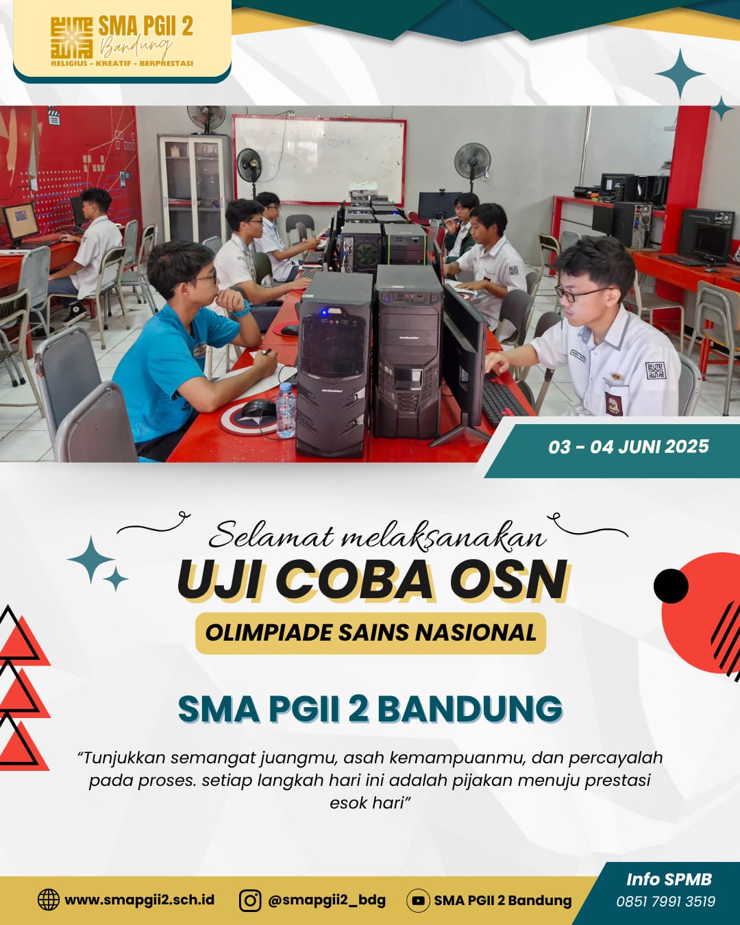 SMA PGII 2 Bandung kembali menunjukkan komitmennya dalam mencetak generasi unggul melalui pelaksanaan Olimpiade Sains Nasional (OSN) 2025. Kegiatan ini dilaksanakan pada tanggal 3 dan 4 Juni 2025 dan diikuti oleh beberapa siswa dari jenjang kelas X dan XI.