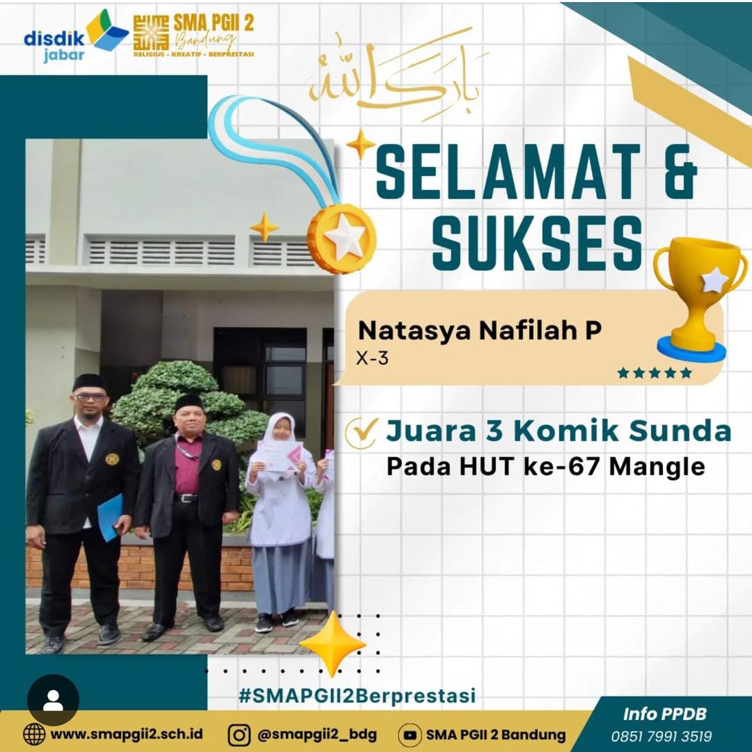 Alhamdulillah, siswa kami yang bernama Natasya Nafilah P (X3) telah berhasil meraih:Juara 3 Lomba Komik Sundadalam rangka memperingati HUT ke-67 MangléTerus semangat dalam berjuang, Semoga prestasi yang diraih menjadi motivasi untuk siswa siswi SMA PGII 2 Bandung lainnya