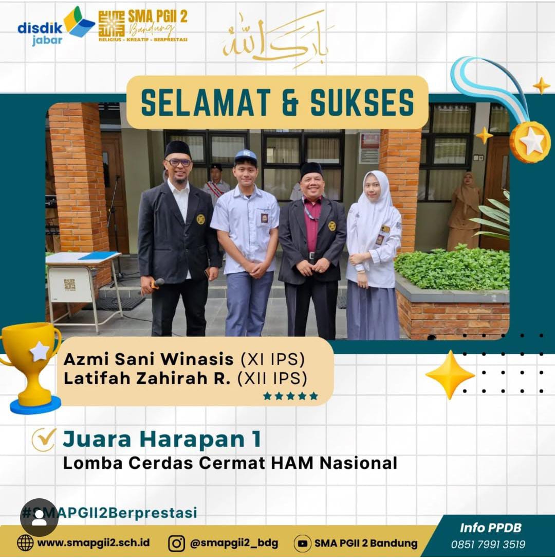 Alhamdulillah, siswa kami yang bernama Azmi Sani Winasis (XI IPS) dan Latifah Zahirah Ramadhani (XII IPS) telah berhasil meraih:Juara Harapan 1pada Lomba Cerdas Cermat HAM Nasional dengan tema Merayakan Hari HAM SeduniaTerus semangat dalam berjuang, Semoga prestasi yang diraih menjadi motivasi untuk siswa siswi SMA PGII 2 Bandung lainnya