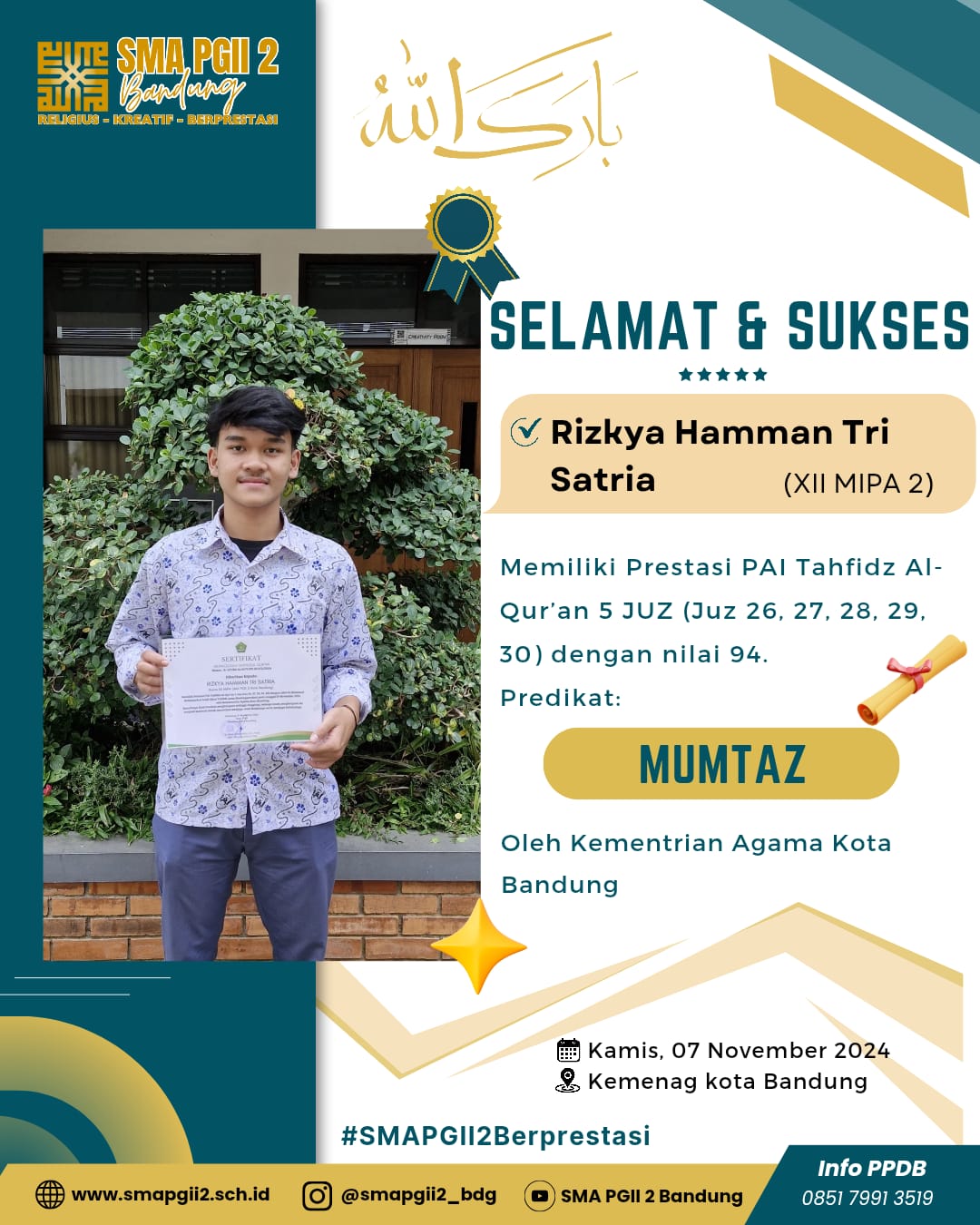Rizkya Hamman Tri Satria adalah siswa kelas XII MIPA 2 SMA PGII 2 yang telah meraih prestasi hapalan Alquran 5 juz Tahfidz dengan predikat Mumtaz. Ia telah menunjukkan kemampuan yang sangat baik dalam menghafal dan memahami isi Alquran.