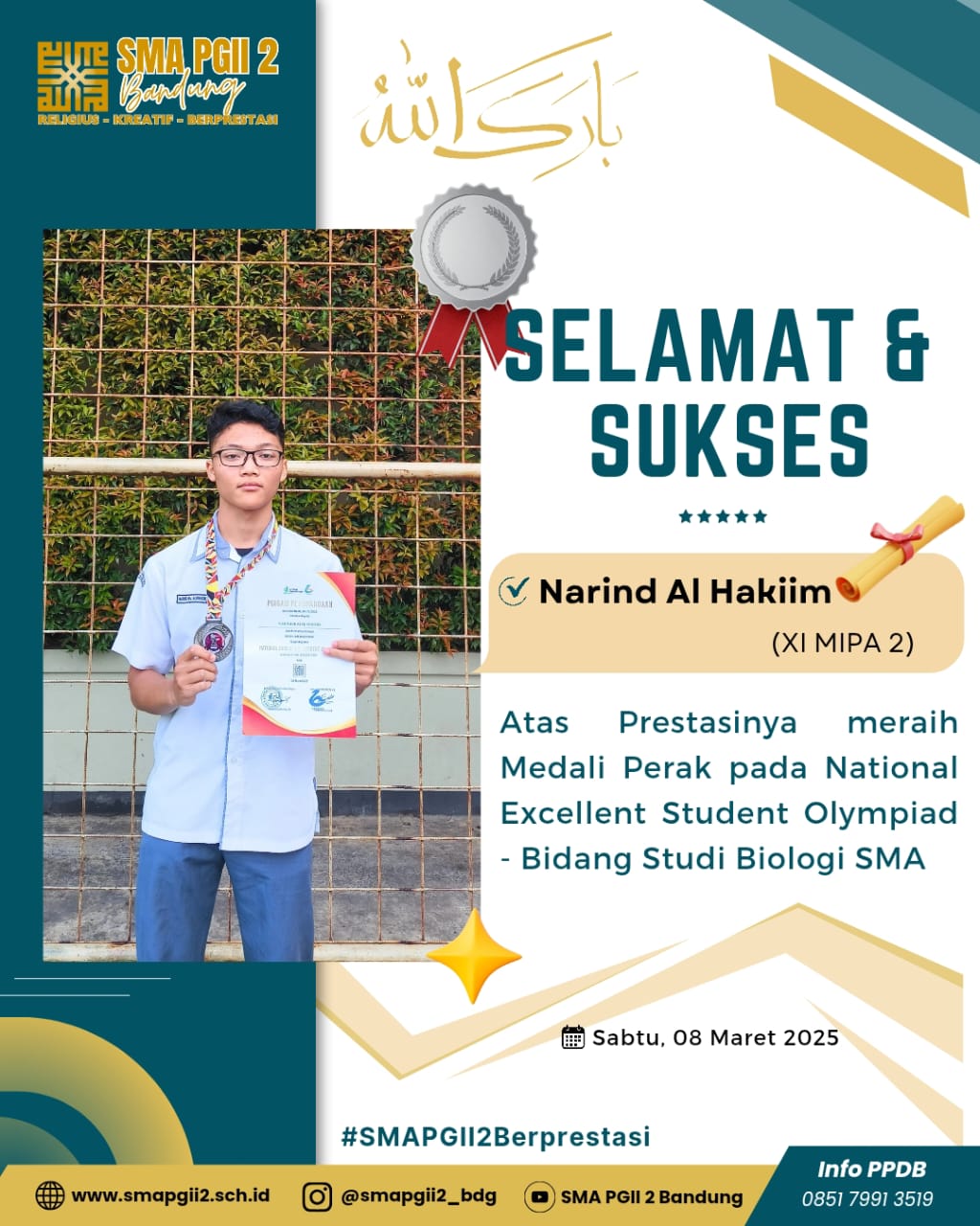 Selamat kepada Narind Al Hakim atas Prestasi Cemerlangnya!SMA PGII 2 Bandung dengan penuh rasa bangga mengucapkan selamat kepada siswa kami, Narind Al Hakim dari kelas XI MIPA 2, yang telah mengukir prestasi membanggakan dalam ajang National Excellent Student Olympiad.🏅 Prestasi yang diraih: 🥈 Medali Perak Bidang Studi: Biologi – Jenjang SMAKeberhasilan Narind meraih medali perak di tingkat nasional merupakan hasil dari semangat juang, kerja keras, dan dedikasi luar biasa dalam mendalami ilmu biologi. Pencapaian ini tidak hanya menjadi kebanggaan pribadi, tetapi juga membawa nama baik bagi SMA PGII 2 Bandung.Kami berharap prestasi ini menjadi motivasi bagi seluruh siswa untuk terus mengembangkan potensi dan tidak pernah berhenti belajar.Hebat, Narind! Terus melangkah dan jadilah inspirasi!