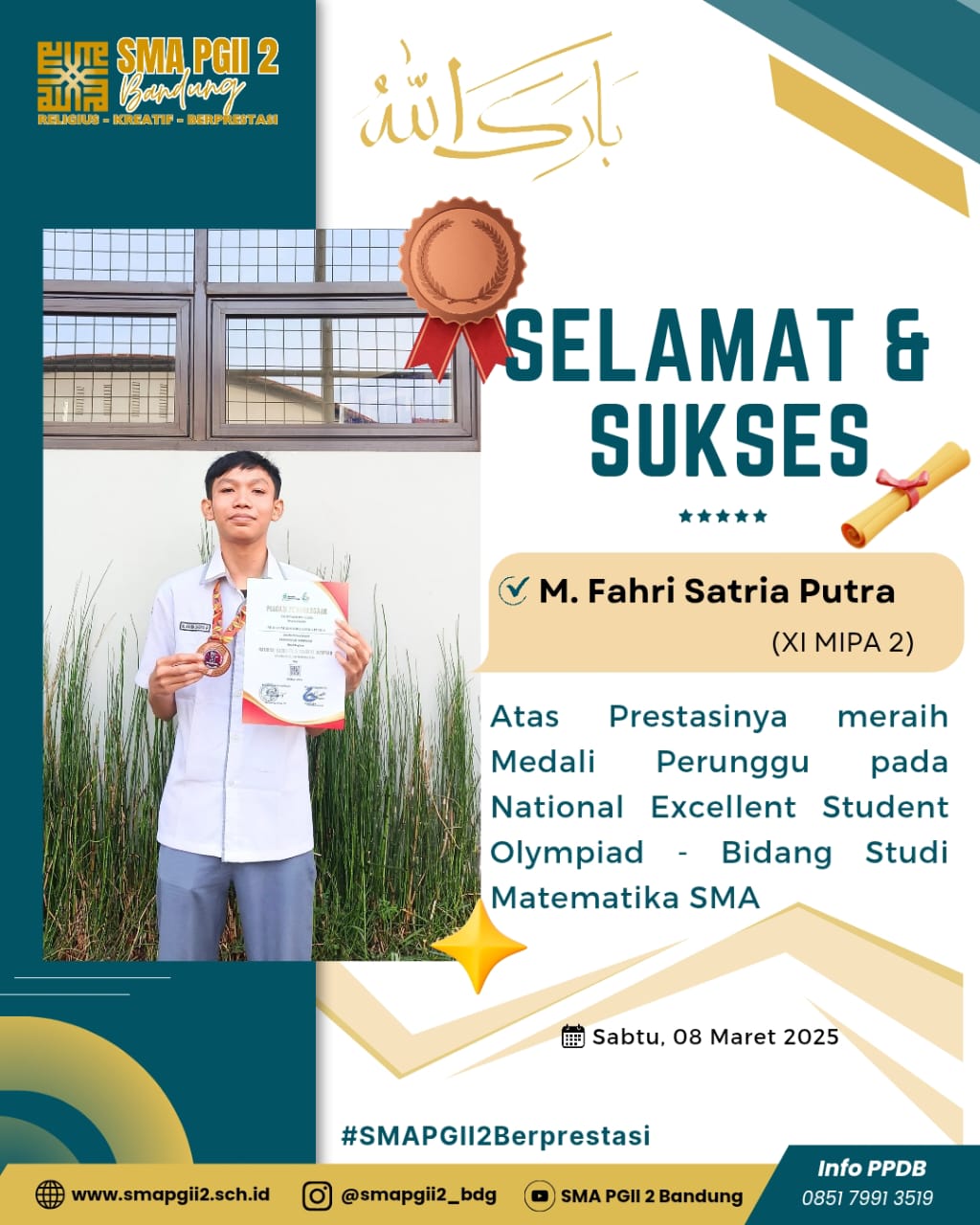 Selamat kepada M. Fahri Satria Putra atas Prestasi Gemilangnya!SMA PGII 2 Bandung dengan bangga mengucapkan selamat dan apresiasi setinggi-tingginya kepada siswa kami tercinta, M. Fahri Satria Putra dari kelas XI MIPA 2, yang telah berhasil mengharumkan nama sekolah dalam ajang bergengsi National Excellent Student Olympiad.Prestasi yang diraih:Medali Perunggu Bidang Studi: Matematika – Jenjang SMAKompetisi ini mempertemukan para siswa terbaik dari berbagai penjuru Indonesia, dan pencapaian Fahri menjadi bukti nyata semangat belajar, kerja keras, serta dedikasi tinggi dalam bidang akademik, khususnya matematika.Semoga prestasi ini menjadi inspirasi bagi seluruh siswa SMA PGII 2 Bandung untuk terus berprestasi dan membawa nama baik sekolah di tingkat nasional maupun internasional.Teruslah berjuang dan berkarya, Fahri! Kami bangga padamu!